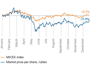 Company capitalization as of December 31, 2012 was RUB 50.34 billion (USD 1.65 million), which is 9.9% less than on December 31, 2011 (the decline in USD terms was 5.2%).